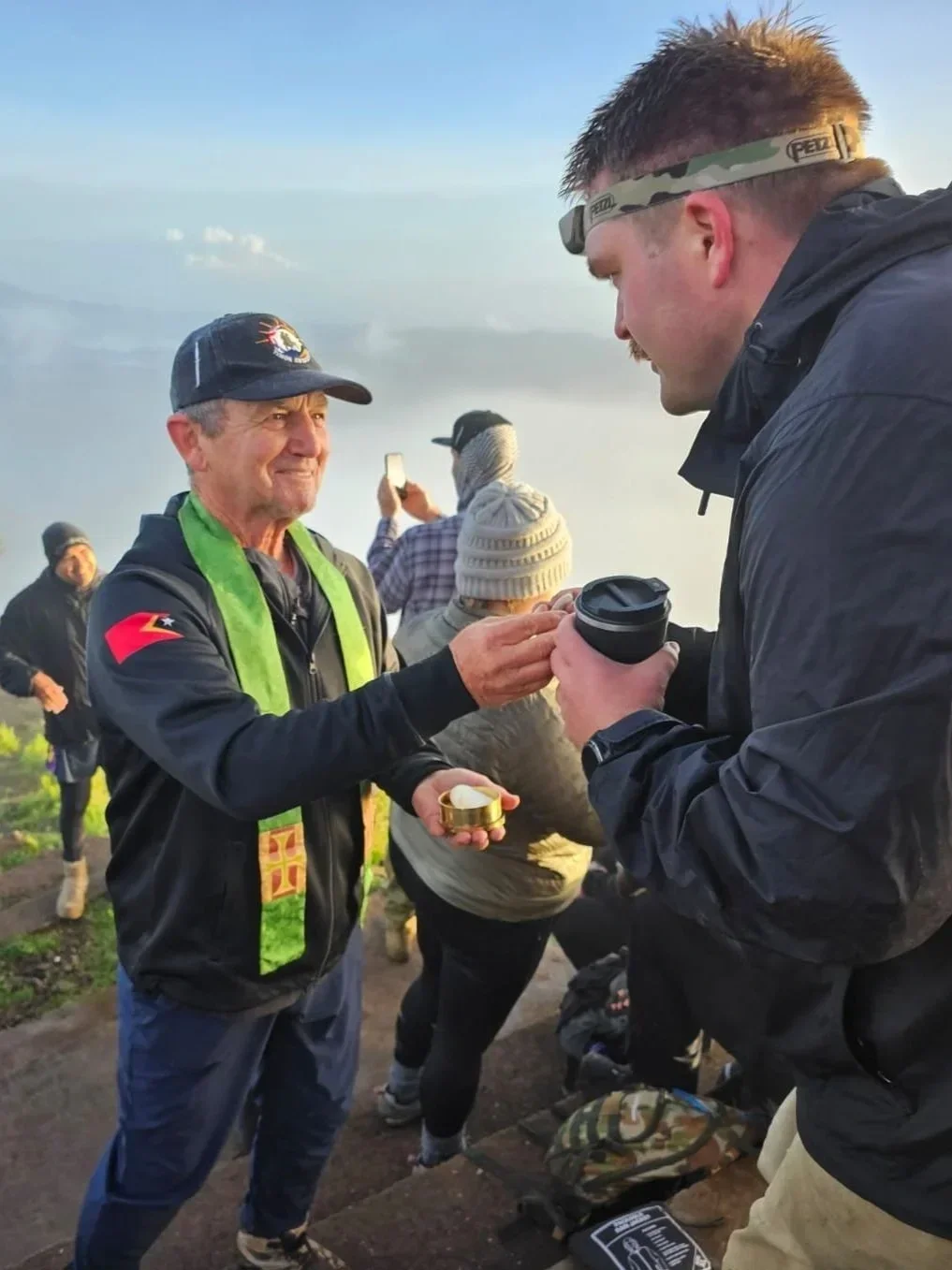 Padre Stone offers communion to a Timor Awakening participant on the peak of Timor-Leste’s